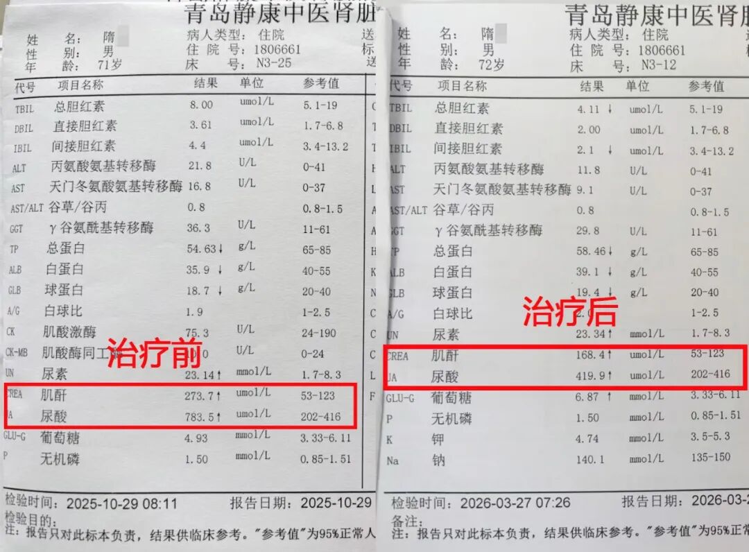 从担忧到安心:一位慢性肾衰患者的求医之路 去年10月,隋先生带着沉重的心理负担来到医院,那时的他,身体状况堪忧:周身水肿,胸闷,气短,乏力,腰酸腰痛,畏寒肢冷,血肌酐273.7umol/L,尿酸高达783.5umol/L。 被确诊慢性肾衰竭,这个诊断像一块巨石压在隋先生心头。很多人认为,一旦确诊慢性肾衰,肾功能只会“一路下滑”,最终走向透析甚至肾移植。 图片 中西医结合:不只“降指标”,更在“护根本” 经过专家组辨证后,为隋先生制定了个体化的中西医结合治疗方案。与单纯追求“降肌酐、降尿酸”不同,这一方案的核心思路是: 西医精准控制:针对高尿酸、高肌酐等指标,合理用药,快速控制病情进展的“火势”; 中医辨证调理:通过中药内服、外治等方法,健脾益肾、活血化瘀、通腑泄浊,改善肾脏微循环,修复受损肾功能。 同时,主管医生苏主任特别叮嘱饮食控制、作息调整、用药规范等“小事”,让治疗贯穿生活的每一个环节。 隋先生感慨地说: “苏主任不仅医术好,叮嘱得也细。什么能吃、什么少吃、药怎么调、觉怎么睡,她都说得很清楚。这种被重视、被照顾的感觉,让我特别踏实。” 经过中西医结合治疗与出院后坚持带药持续调理,隋先生最近一次复查结果令人欣喜: 血肌酐:168.4umol/L(较之前降幅近40%),尿酸:419.9umol/L(接近正常值上限,较之前下降363个单位),消肿十余斤,体重回升,精神状态明显改善,生活质量大幅提升。隋先生不再忧心忡忡,反而有了写诗赞医的雅兴。 慢性肾衰真的不可逆吗? 很多人误以为,慢性肾衰竭一旦确诊,就只能“等着透析”。其实不然。 慢性肾脏病分为5期。在早中期(代偿期、失代偿期),通过规范、系统的中西医结合治疗,完全有可能延缓肾功能下降速度,降低肌酐、尿素氮、尿酸等毒素水平,部分患者甚至可实现肾功能的部分逆转。 当然,需要强调的是:不是所有慢性肾衰都能“逆转”,但绝大多数患者都可以通过积极治疗实现“长期稳定、延缓进展、提高生活质量” 的目标。